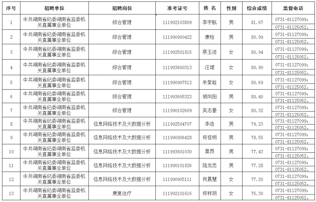 根据《湖南省省直事业单位2025年第二次集中公开招聘工作人员公告》有关要求,经报名、资格审查、笔试、面试、体检、考察等程序,确定李宇航等13名同志为中共湖南省纪委湖南省监委机关直属事业单位2025年公开招聘拟聘用人员,现予以公示。