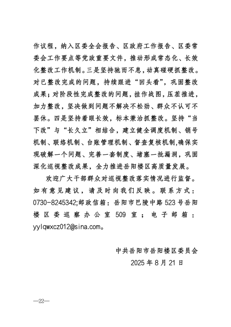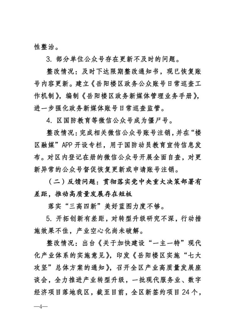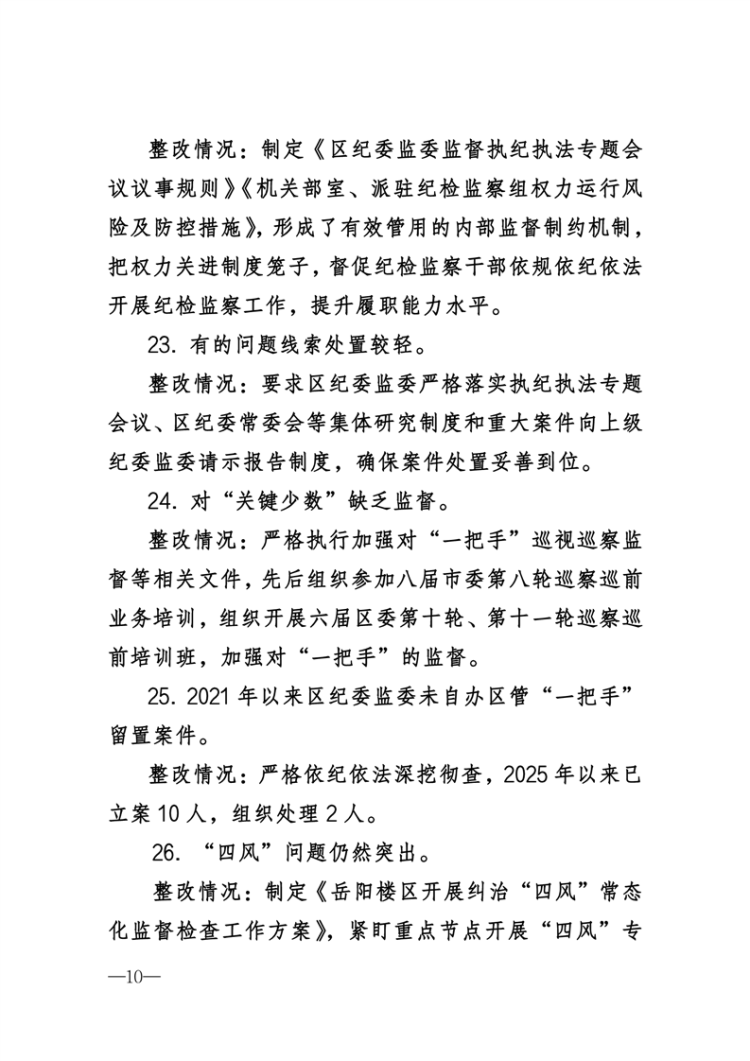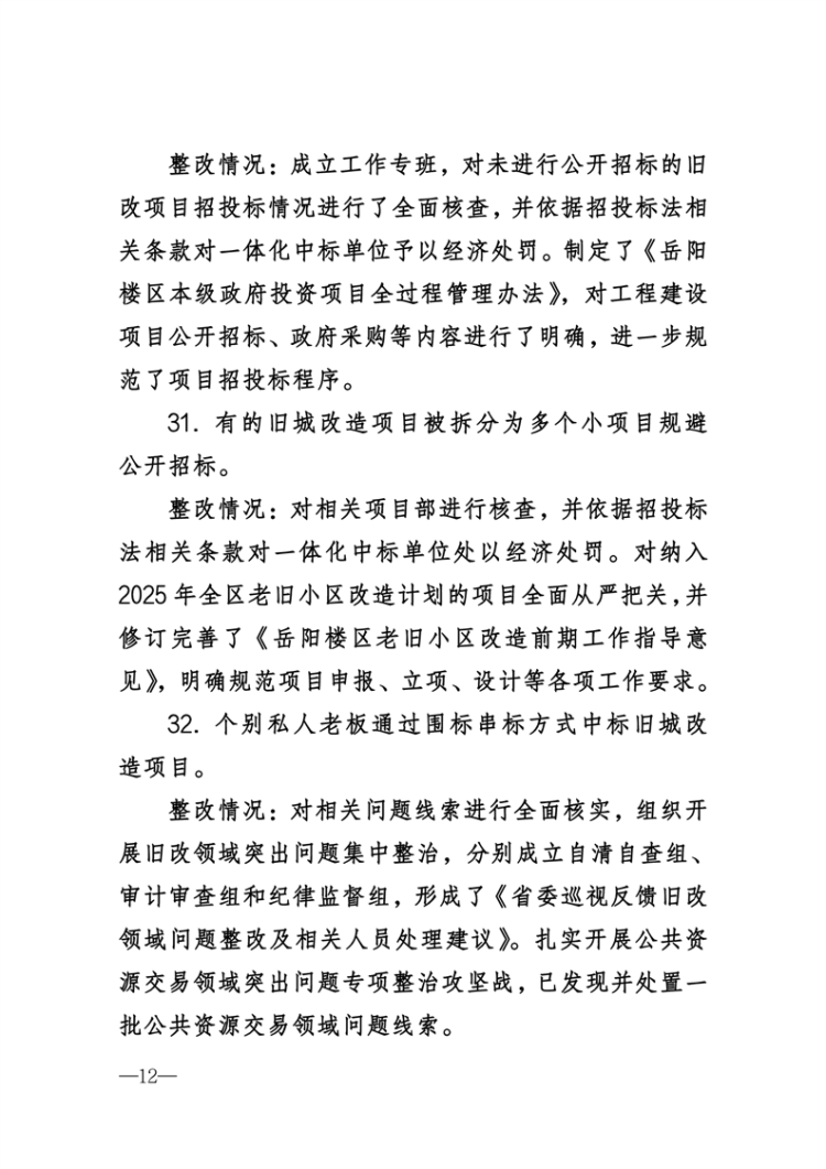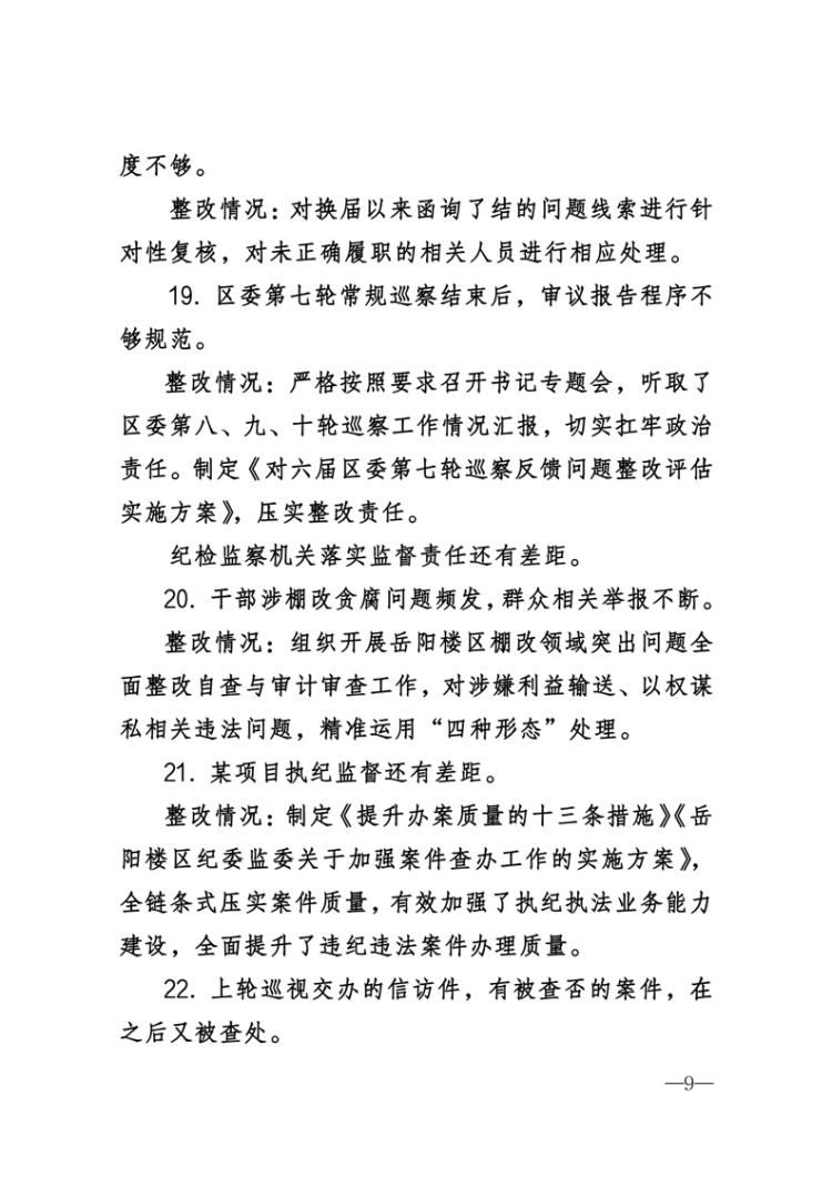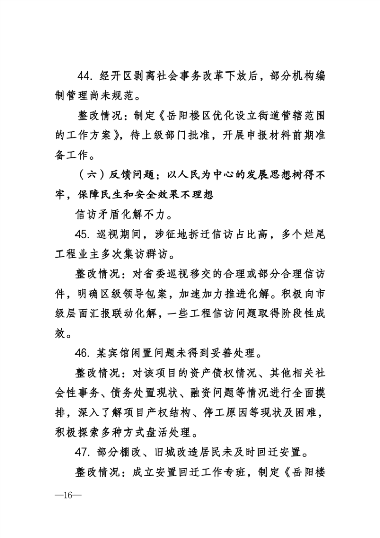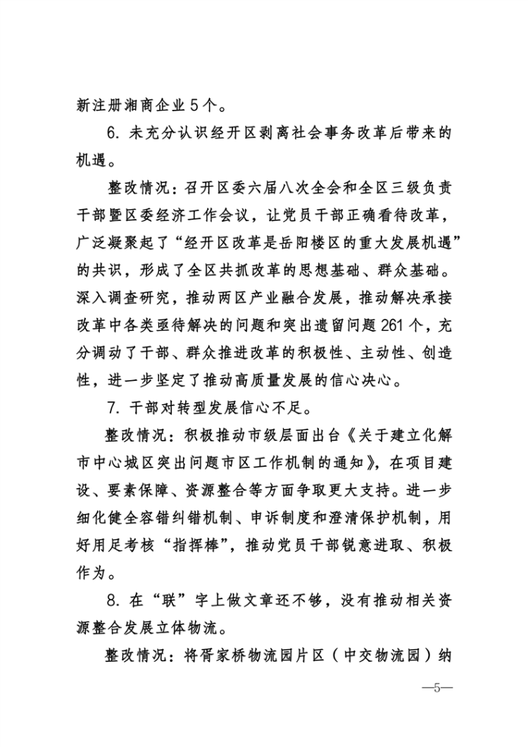 中共岳阳市岳阳楼区委关于巡视整改进展情况的通报